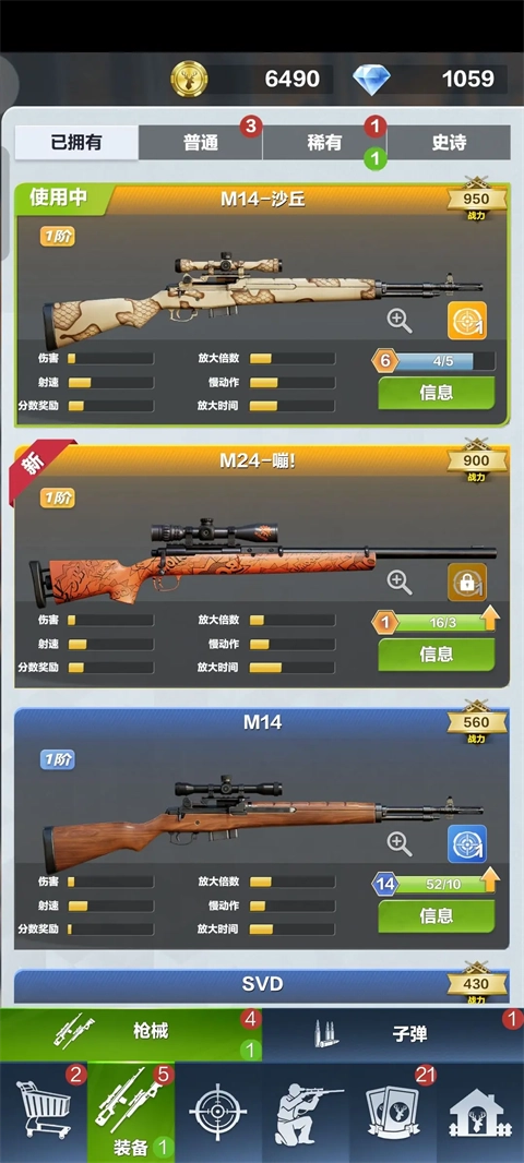 界面分为枪械和子弹两部分,在这里可以查看枪械与子弹的详细信息及获取条件,后续的保养和升级操作也都在此处进行。