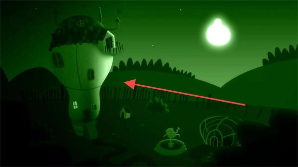 在绿色夜晚场景里,依照箭头指示靠近独特的房子。