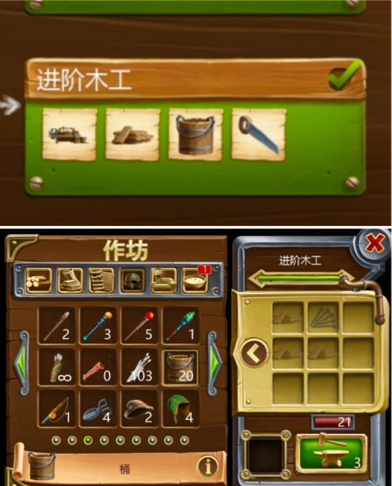 首先得制作水桶,得先解锁科技树最下方那一排的第三个(进阶木工)才能制作,它在制作界面的第四栏里。