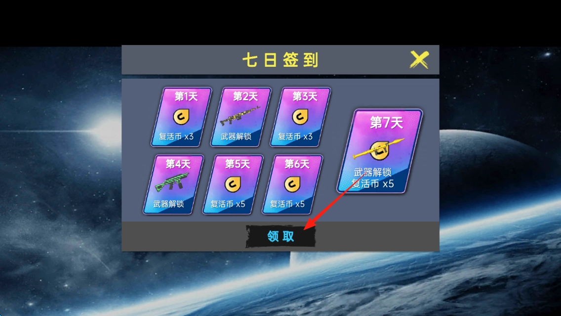 每天登录游戏完成七天签到,点击即可领取对应天数的奖励,以此来积累复活币和武器。