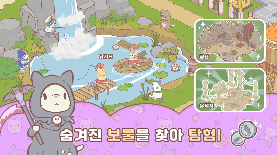 2、我们还可以和自己的猫一起去池塘、矿井和其他地方探索,找到神秘的宝藏,并在夜市中换取金币~