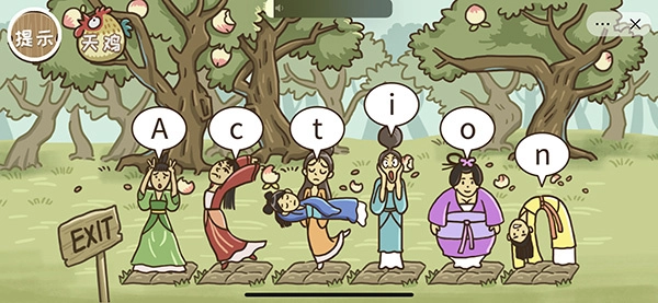 通关技巧:按照图示顺序,把七个仙女依次拖动到方块上,让它们组成【Action】这个英文单词就能通关了。