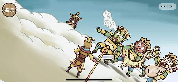 通关技巧:第一步先点击左上角的树枝,此时会出现一只蝉;接着把左边第一个人手里的油漆拖到蝉的身上,蝉就会变成金蝉;最后将金蝉拖到右边和尚的头上,就能召唤出唐僧,顺利完成解救。