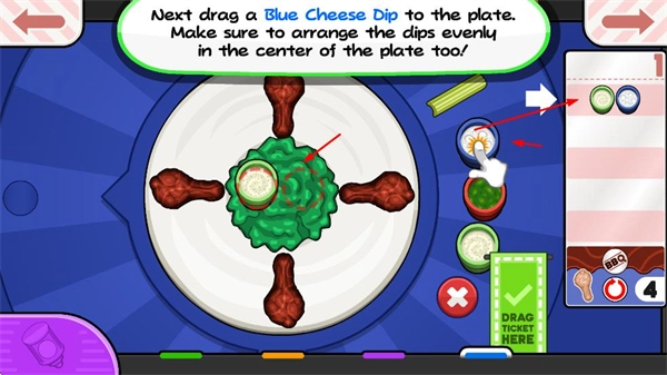 把食材从左边拖到餐盘里,按照要求摆放整齐,要是票据上有对应的标识,就得把食材摆成均匀的圆形图案。