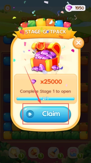 领取礼盒的规则如下:当分数累计达到1950时,界面会弹出STAGE GIFTPACK提示,此时点击“Claim”按钮,即可领取25000的奖励,同时解锁下一个关卡。