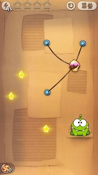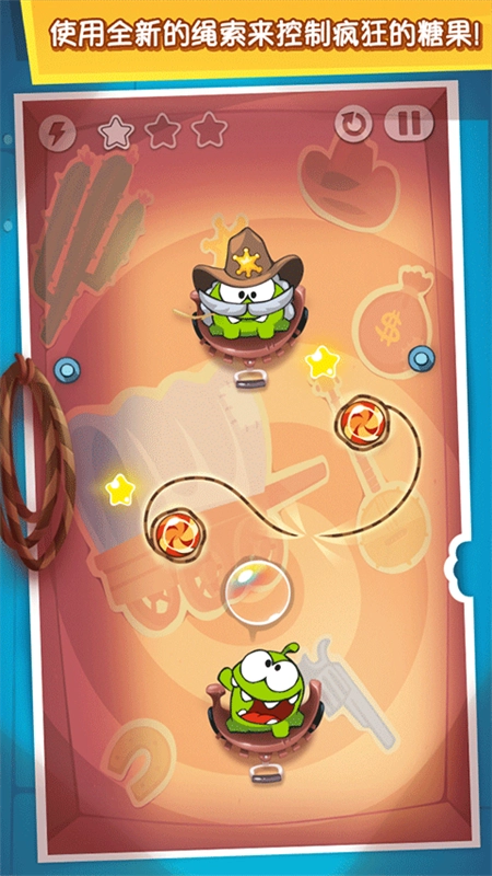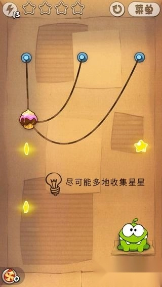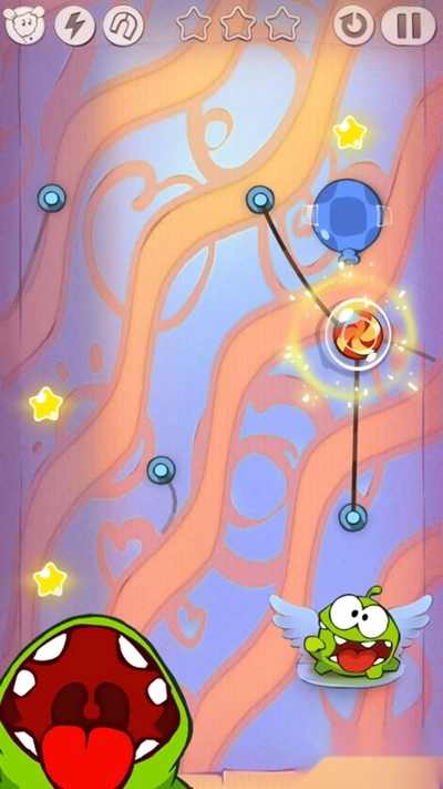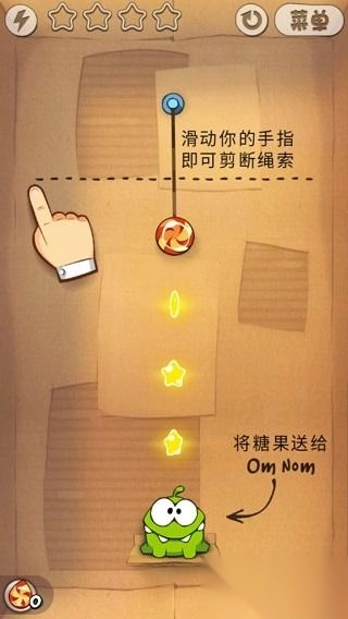 第三关和第二关的玩法是一样的,都需要玩家掌握好摆动的角度。首先得切断右侧的第一根绳子,然后在糖果摆到碰到星星的最高点时,立刻切断上方的第二根绳子,这样第三颗星星就能轻松到手了。