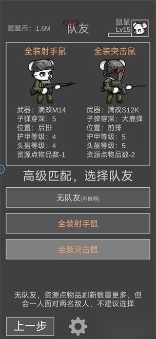 最后要划重点了,队友选突击鼠鼠的话,尽量看广告刷个紫色品质以上的,这样能抗又能打,突击鼠里最推荐带鹿弹达姆弹的那款。