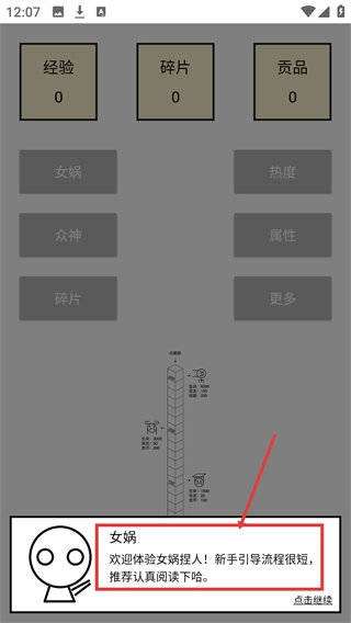 新手引导流程简洁明了,仔细阅读【女娲】的提示后点击继续,就能快速掌握游戏的核心玩法。