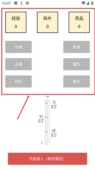 主界面会展示【经验】【碎片】【贡品】这三类资源,点击【开始捏人(新的冒险)】按钮,即可开启爬塔挑战。