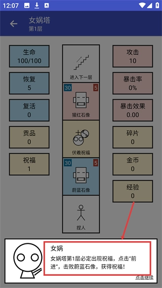 在女娲塔的第一层,你需要先依次击败【绯红石像】与【蔚蓝石像】来获取对应的奖励,之后点击【伏羲祝福】即可提升角色的能力。