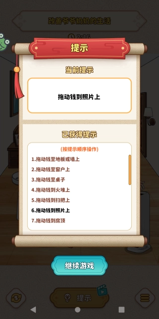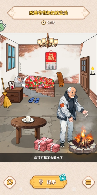 点击画面下方的钞票,把它挪到房屋里那些需要改进的地方,就能帮爷爷奶奶改善生活啦。
