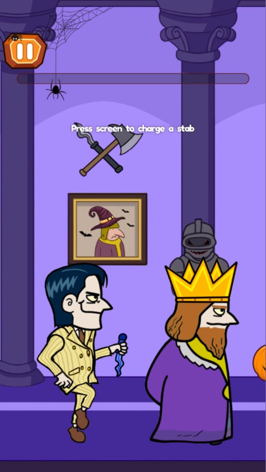 当角色靠近国王时,长按屏幕进行蓄力,等蓄力条填满后角色就会挥刀刺向国王。要是在蓄力过程中看到国王有回头的动作,得马上松开手指,避免被他抓住。