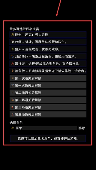 在角色选择界面,你可以挑选【战士】【牧师】【猎人】【烈焰法师】等职业,来组建一支最多包含四名成员的冒险队伍。