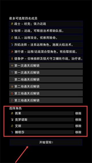 选够四名角色后,点击界面底部的【开始冒险!】按钮,就能正式开启地牢像素风格的放置冒险之旅了。