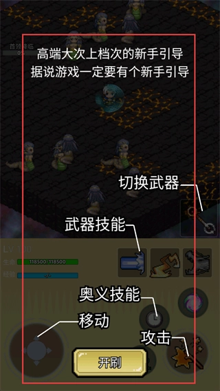 在新手引导阶段,你需要熟悉【移动】和【攻击】按钮,同时掌握【切换武器】的操作以及技能的使用方法,之后点击【开刷】按钮即可开启战斗。
