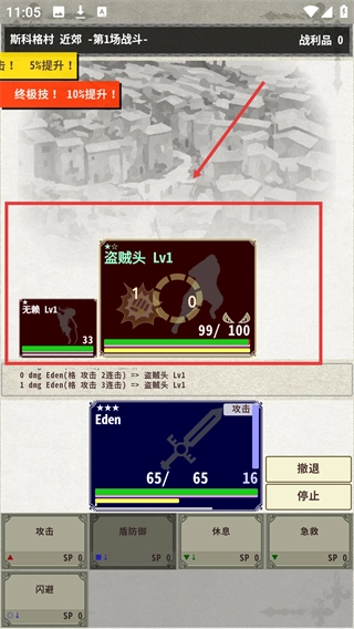 战斗时留意【盗贼头-Lv1】和【无赖-Lv1】的HP条,操控【Eden】选取攻击指令展开战斗。