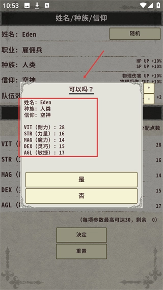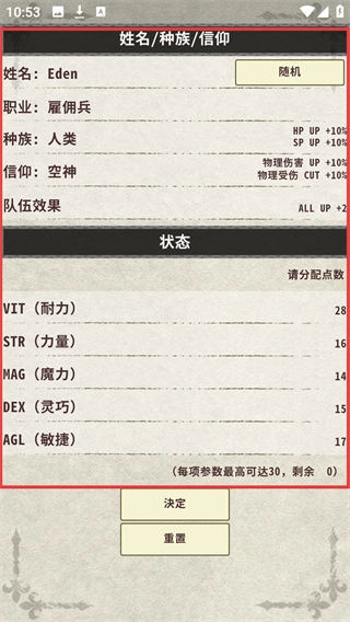 在创建角色的过程中,需要对【姓名】、【种族】、【信仰】以及【VIT】、【STR】这类参数进行设置,待确认无误后,点击【决定】按钮即可完成角色创建。