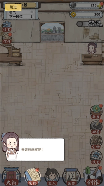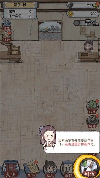 进入游戏后,你要经营一家画室,经营画室的第一步是创作画作,点击右下角的“创作画作”按钮即可开始。