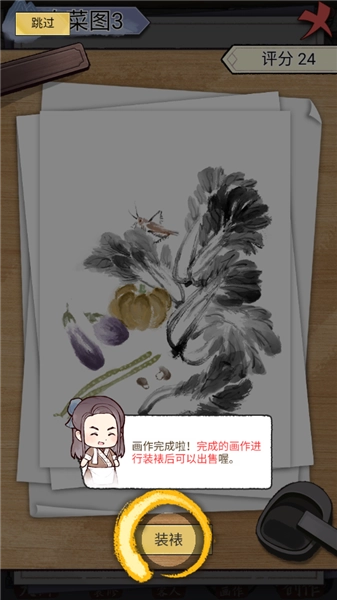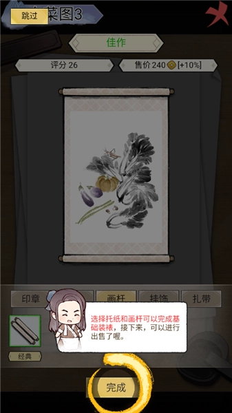 画作完成后,需进行装裱操作,按顺序挑选托纸、画杆、印章等材料,再点击完成按钮即可。