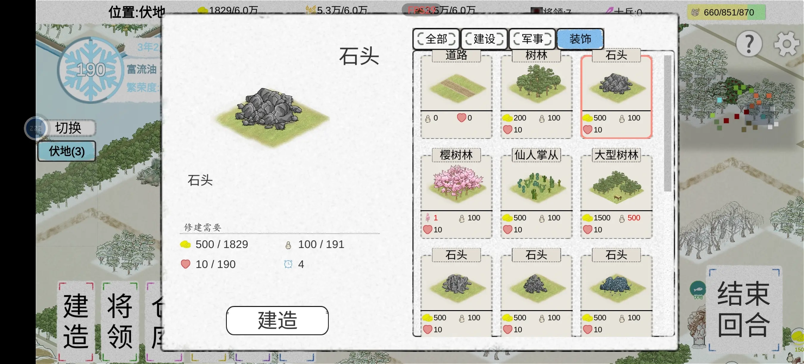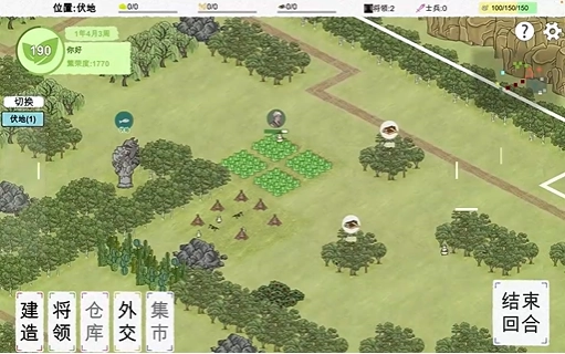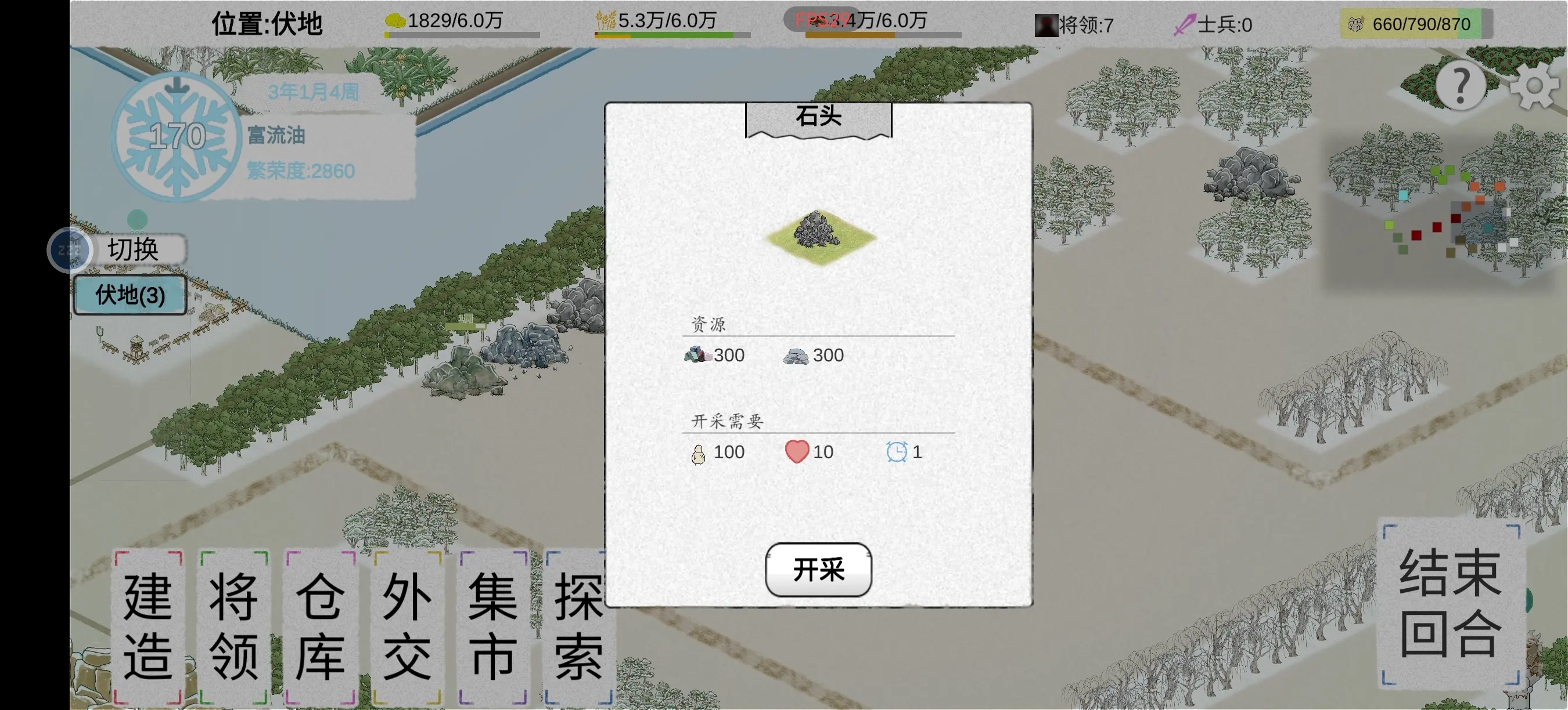 然后开垦一片土地,等人口每回合增长时就能砍树采石,第一次土地收获后人口差不多就满了,正好可以修建一座仓库。