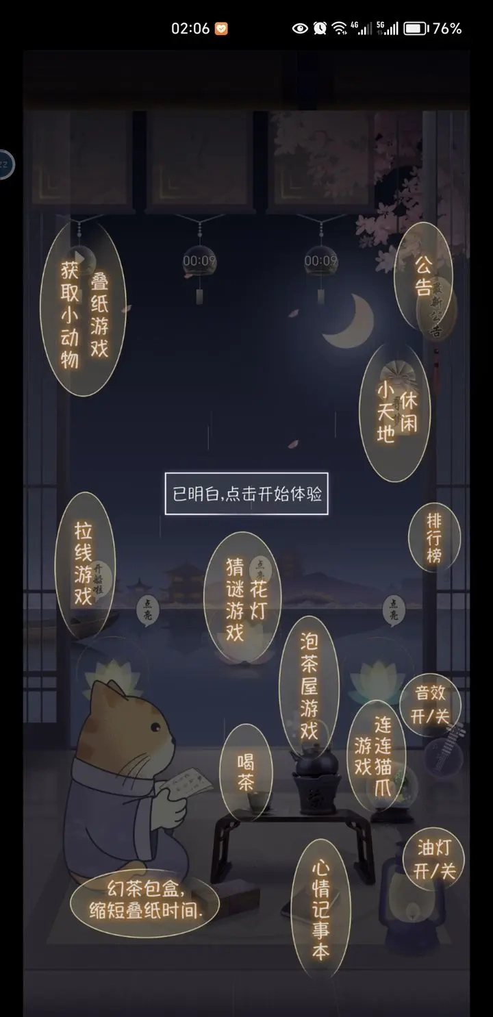 左上角那个特别大的卷轴其实是折纸,寻梦对应的是类似华容道的连线游戏,湖面上的三朵莲花是猜谜环节,船则是翻绳游戏,屋子里地上的木盒装的是茶包,不过目前还不清楚它具体的使用效果。