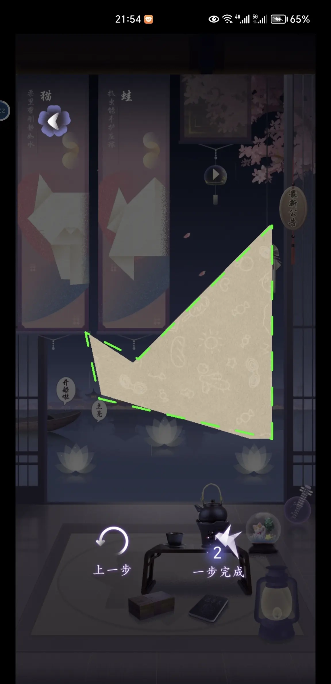 折纸需要在当前界面等待读秒结束才会解锁,等出现播放按钮时就能开始体验了。核心操作是按住纸张最远端的那个角进行拖动,调整其位置,让折纸呈现出白色框框所示范的形状——你可以想象成自己用手捏着那个角在折叠,如果折得合适,框框会变成绿色;要是折得不对,还能点击上一步返回重新尝试。完成折纸后会触发小剧场和小游戏,通关之后会获得茶包作为奖励,而你折好的小动物也会出现在小花园中。