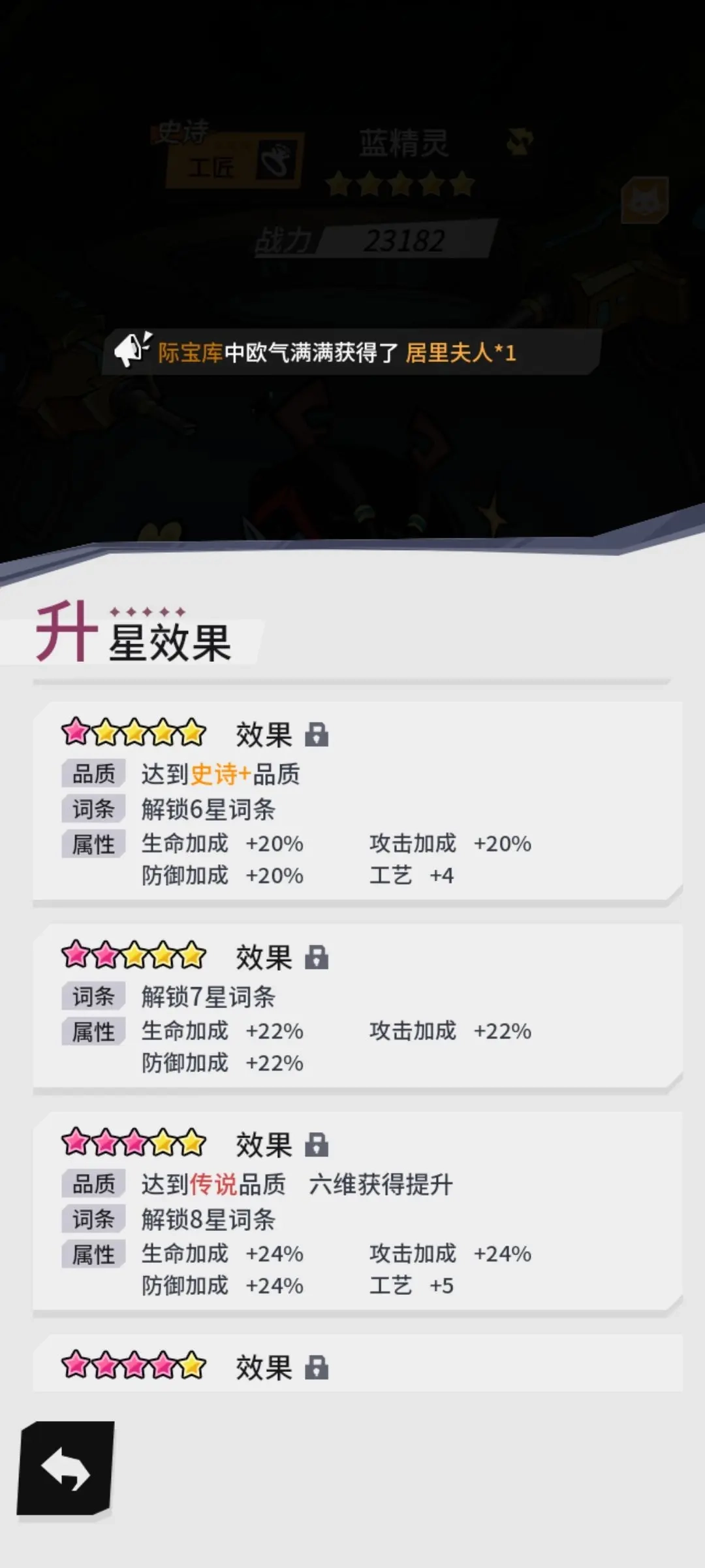 居里夫人对应的是武器,盖亚对应的是服饰,蓝精灵对应的是工艺,这三个初始词条以及升星加成所对应的都是技艺。
