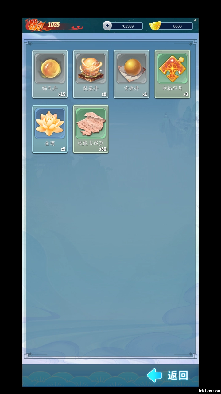 背包和装备栏可供查看自身已有的道具与装备,装备还能进行升级操作。