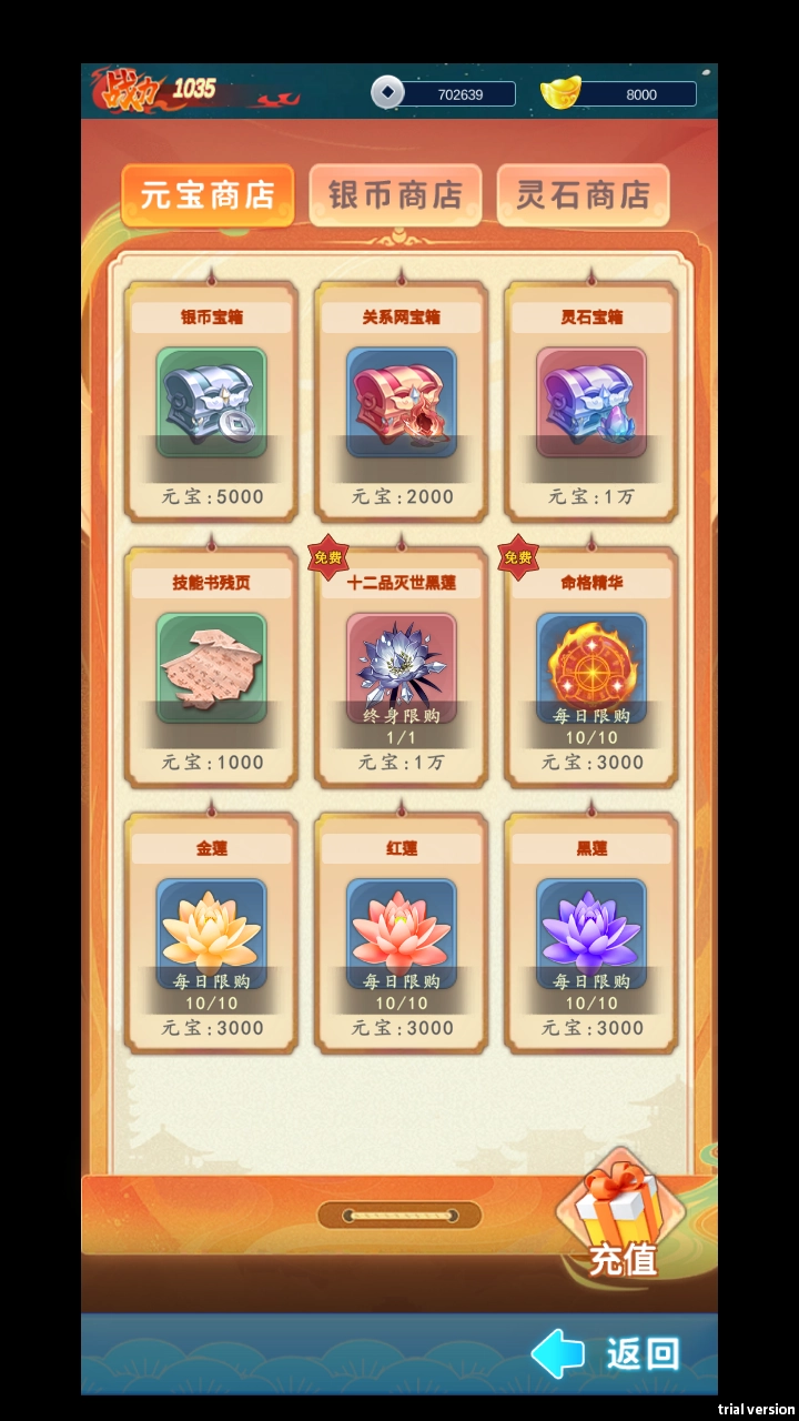 游戏内的商店包含元宝商店、银币商店与灵石商店这三种类型。