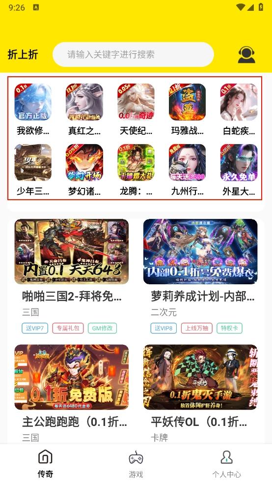 折上折游戏福利活动来袭!全场游戏折扣力度惊人,低至0.05折起,这里汇聚了海量热门游戏的超值优惠信息。玩家上线即可轻松解锁丰厚福利,畅享前所未有的畅玩体验。无论是策略对战、传奇冒险、仙侠修真还是卡牌收集等各类游戏类型,应有尽有,每款游戏都能享受专属折扣福利。