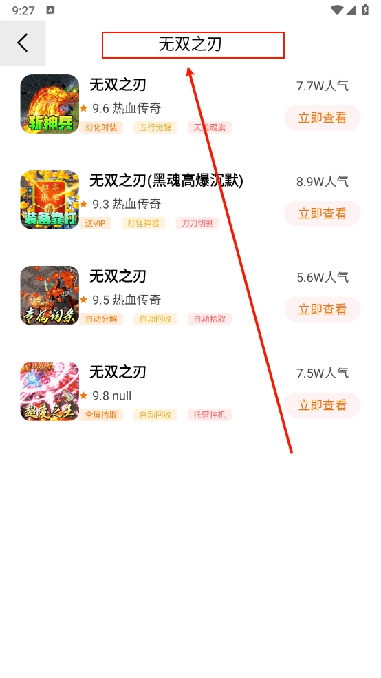 点击页面顶部的搜索框,只需一键操作,就能搜索到你钟爱的游戏,像“无双之刃”就可以这样查找。