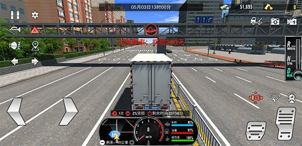 在运输环节,玩家需借助下方地图指引前往运输终点。不过在途中要记得系好安全带——就是刹车上方的红色图标,同时切勿违反交通规则、发生撞车等情况,否则不仅会被罚款扣款,还会导致货物损坏。