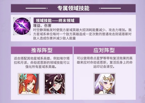 领域技能能够降低我方星域系英雄大招的能量消耗,同时提升其攻击力,建议搭配埃尔塔拉、月读等其他星域系英雄,以此提高大招的释放频率!