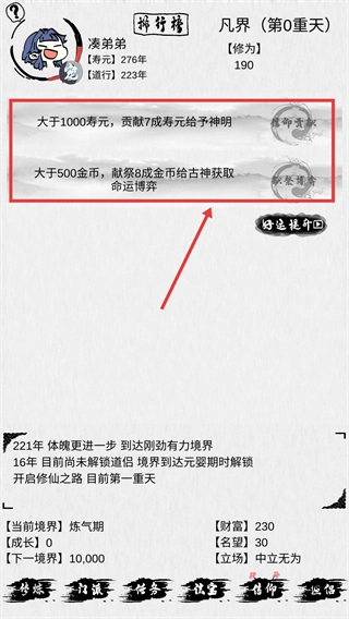 满足条件后,可在信仰贡献与祭祀博弈之间择一进行,通过消耗寿元或金币,来获取与命运相关的修炼契机。