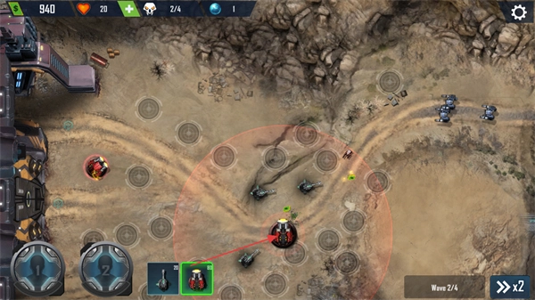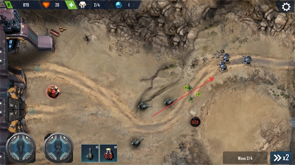 点击下方带有标识的防御塔,将其部署在敌方行进路径旁的空位上,确保防御塔的攻击范围能够覆盖路径区域,以此来准备拦截Wave2和Wave4的敌方单位。