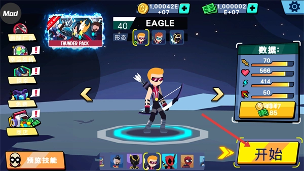 在角色界面打开【EAGLE】的数据面板,核对属性信息后点击【开始】按钮进入战斗关卡。