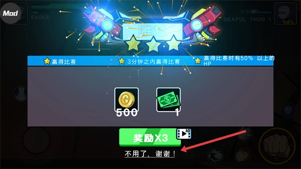 战斗获胜后会弹出奖励界面,点击【不用了,谢谢!】即可领取基础奖励。