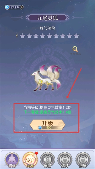在培养【九尾灵狐】的过程中,消耗【500】资源并点击升级按钮,能够把灵气效率从1.2倍提高到1.4倍,从而让修炼进度得到加快。