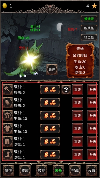 战斗过程中可以点击【暂停】按钮,消耗金币和星星通过【洗练】功能提升生命、攻击、防御这三项资质,从而增强自身的战斗能力。