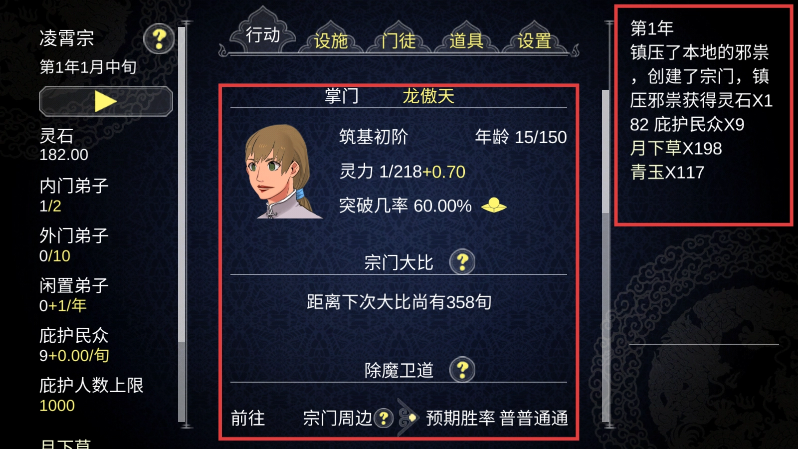 查看掌门【龙傲天】的状态和突破几率,留意宗门大比的时间安排,借助资源合理规划修炼进程与宗门发展。