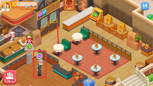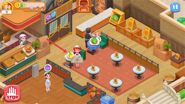 在餐厅的主界面中,点击与餐食相关的图标,即可进入营业关卡,为接待顾客、开展服务做好准备。