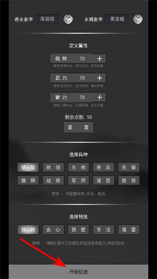 完成属性加点与选择后,点击“开始征途”按钮即可开启关卡,这是进入战斗流程的关键操作,只有准确点击才能进入战局。