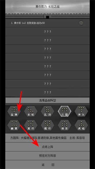 在游戏里,你可以根据箭头的指引来挑选出战阵型,只要点击对应的阵型图标就行。这一步是用来确定战场布局的,选好之后就能进入点将的环节了。