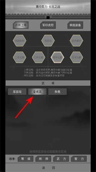 请严格按照提示操作,点击皇甫嵩这位武将,把他添加到上阵列表中。这一步是配置出战武将时至关重要的核心操作,完成选将后,还能对阵型进行提前预览。