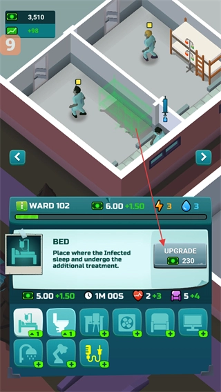 找到BED设施,点击UPGRADE按钮,消耗230资源来升级病床,以此提升治疗效果。