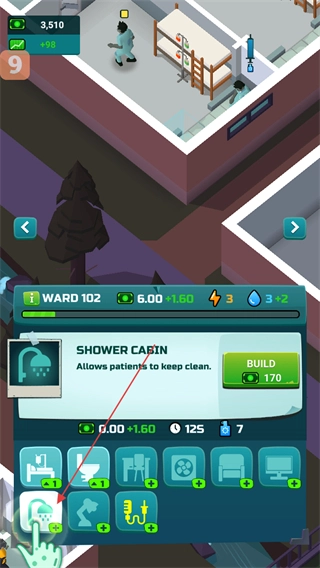 在设施列表里找到SHOWERCABIN,点击BUILD按钮,消耗170资源来建造淋浴舱。