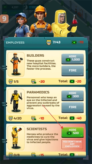 进入雇员界面后,找到SCIENTISTS选项,点击HIRE按钮即可招募科学家,为研发工作提供助力。