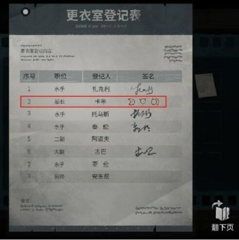 在更衣室登记表中找到卡布队长签名的三个符号。