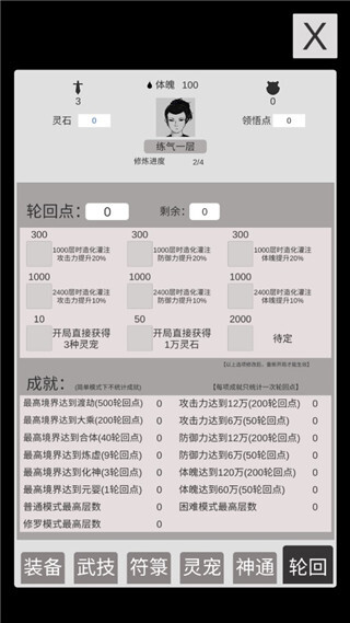 游戏核心玩法是刷等级,重点提升修炼进度。秘境的属性加成十分可观,境界越高,能获取的秘境属性增益就越多,所以要尽可能快速提升境界,解锁更高级别的秘境。