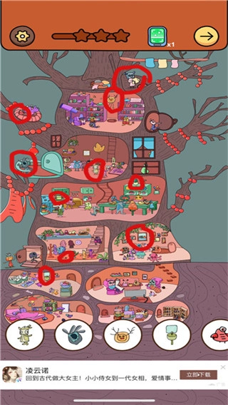 3、每个物品都藏在不同的位置,你需要通过观察一些细节,找到所有物品来完成闯关。